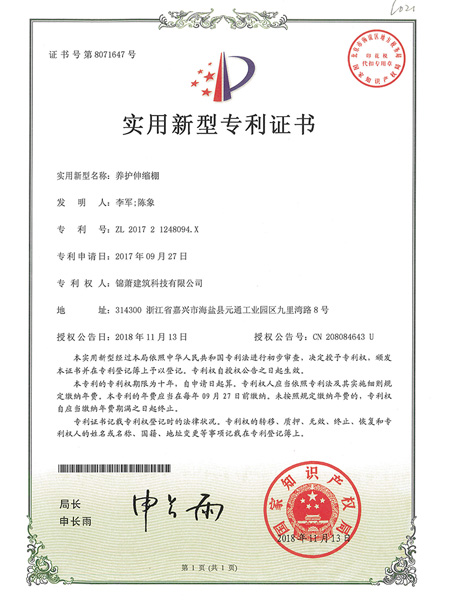 專利證書--養(yǎng)護(hù)伸縮棚