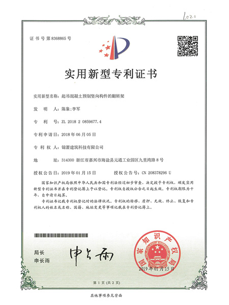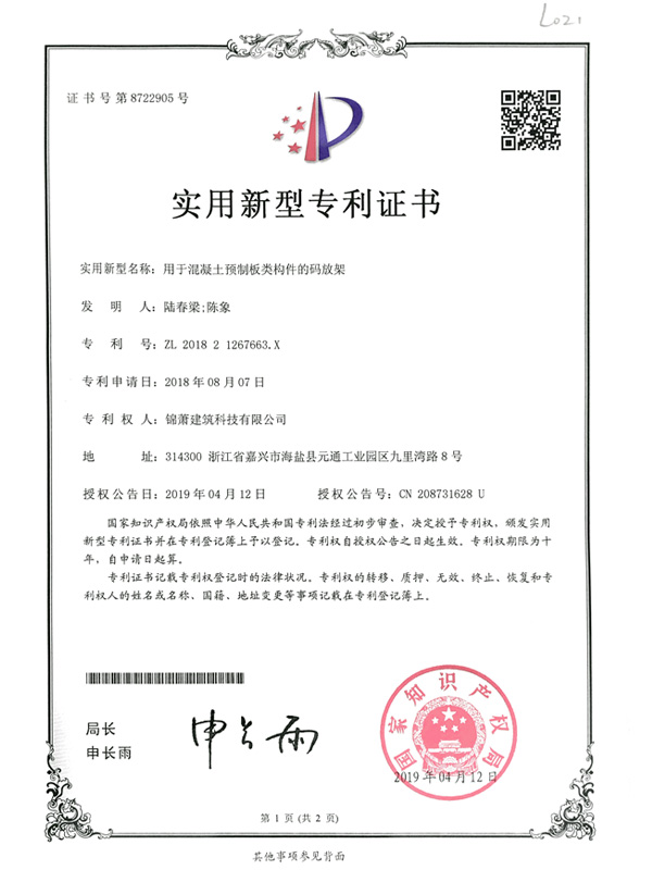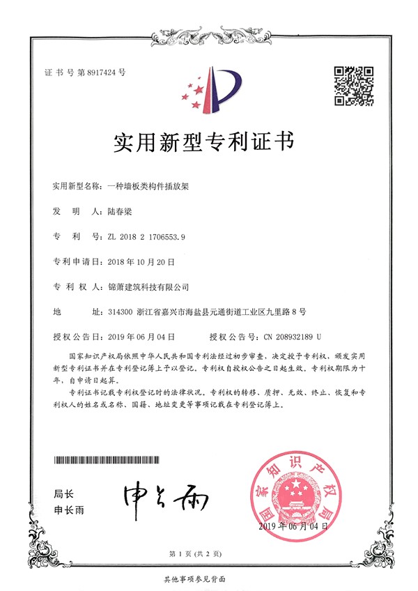 專利證書-一種墻板類構(gòu)件插放架