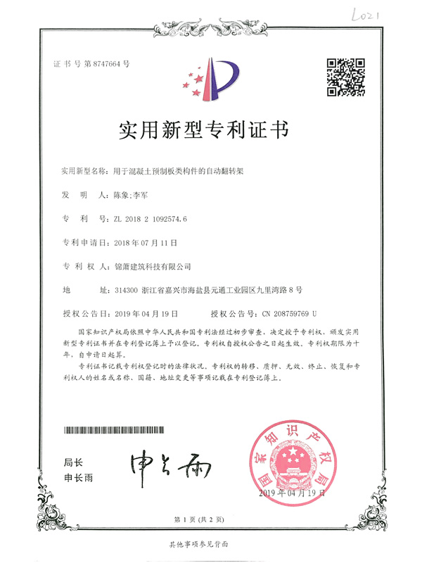 專利證書-自動翻轉(zhuǎn)架