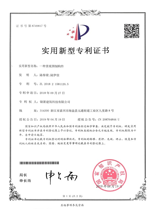 專利證書-一種景觀預(yù)制構(gòu)件