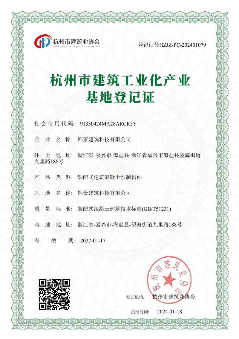 杭州市建筑工業(yè)化產(chǎn)業(yè)基地登記證